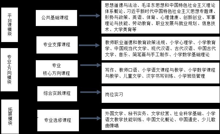 通用能力: 1.具有较强的语言表达、书面写作能力; 2.具有较强的分析问题、解决问题能力; 3.具有较强的组织、协调、沟通能力; 4.具有较强的与人交往、团队协作能力; 5.具有较强的终身学习能力; 6.具有较强的信息技术应用能力; 7.具有较强的独立思考、逻辑推理、信息加工能力; 8.具有较强的创新创意创业能力。 专业能力: 1.具备教材领悟、教学设计、教学操作、教学总结能力; 2.具备书写规范汉字、书面表达、口语表达能力; 3.具有班队管理、教育科研能力; 4.具有教学督导、教育管理、课程资源开发、专业持续发展能力。 |