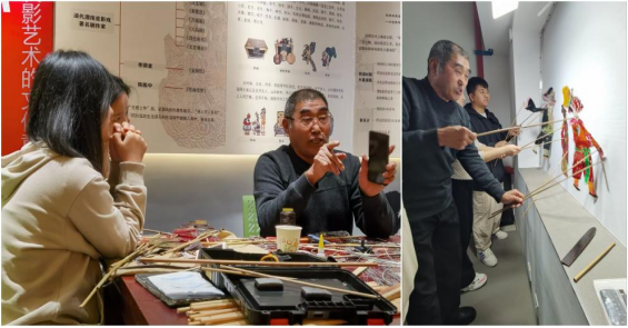 在欧冠官网中华优秀传统文化传承基地“渭南皮影艺术馆”,李天社和刘银顺为皮影社团的学生介绍了渭南皮影的发展历史、艺术特色和独特魅力,进一步激发了同学们对这一国家非物质文化遗产的兴趣和热爱,以及学好皮影表演技艺的信心和决心。两位传承人现场示范并手把手指导学生练习短剧《猴子捞月》《猪八戒背媳妇》《卖杂货》的表演技艺,同学们认真观看老艺人的操作手法,充分体会艺人的手上功夫,同时于一招一式的实践过程中,近距离感受皮影,了解非遗文化,传承非遗技艺,在寓教于美中陶情增智。