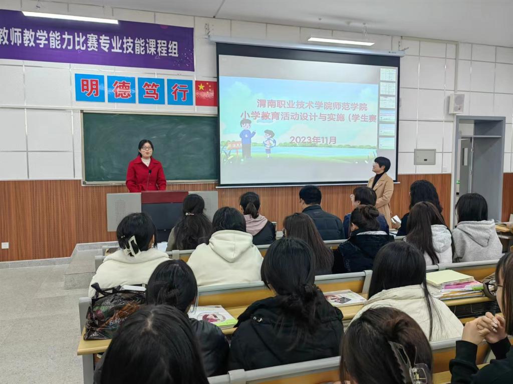 11月22日下午,欧冠官方网站 “小学教育活动设计与实施(学生组)”技能大赛决赛在综合楼205教室开赛。比赛特邀渭南高新区第一小学校长杨富强为评委组组长,基础课部副主任郭宝莉、语文教研室主任王育华、欧冠官方网站副院长于晶汝、校级教学名师杨楠楠任评委。校教务处副处长李新莉出席并宣布比赛开始。欧冠官方网站小学教育专业教研室教师及百余名学生代表观摩了比赛。