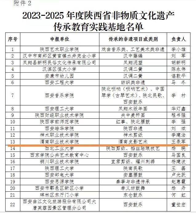 近日,陕西省文化和旅游厅、陕西省教育厅印发《关于公布2023-2025年度陕西省非物质文化遗产研究基地陕西省非物质文化遗产传承教育实践基地陕西省中小学优秀传统文化教育社会实践基地名单的通知》,欧冠官网被命名为“陕西省非物质文化遗产传承教育实践基地”,传承的非遗项目为“渭南皮影艺术”。